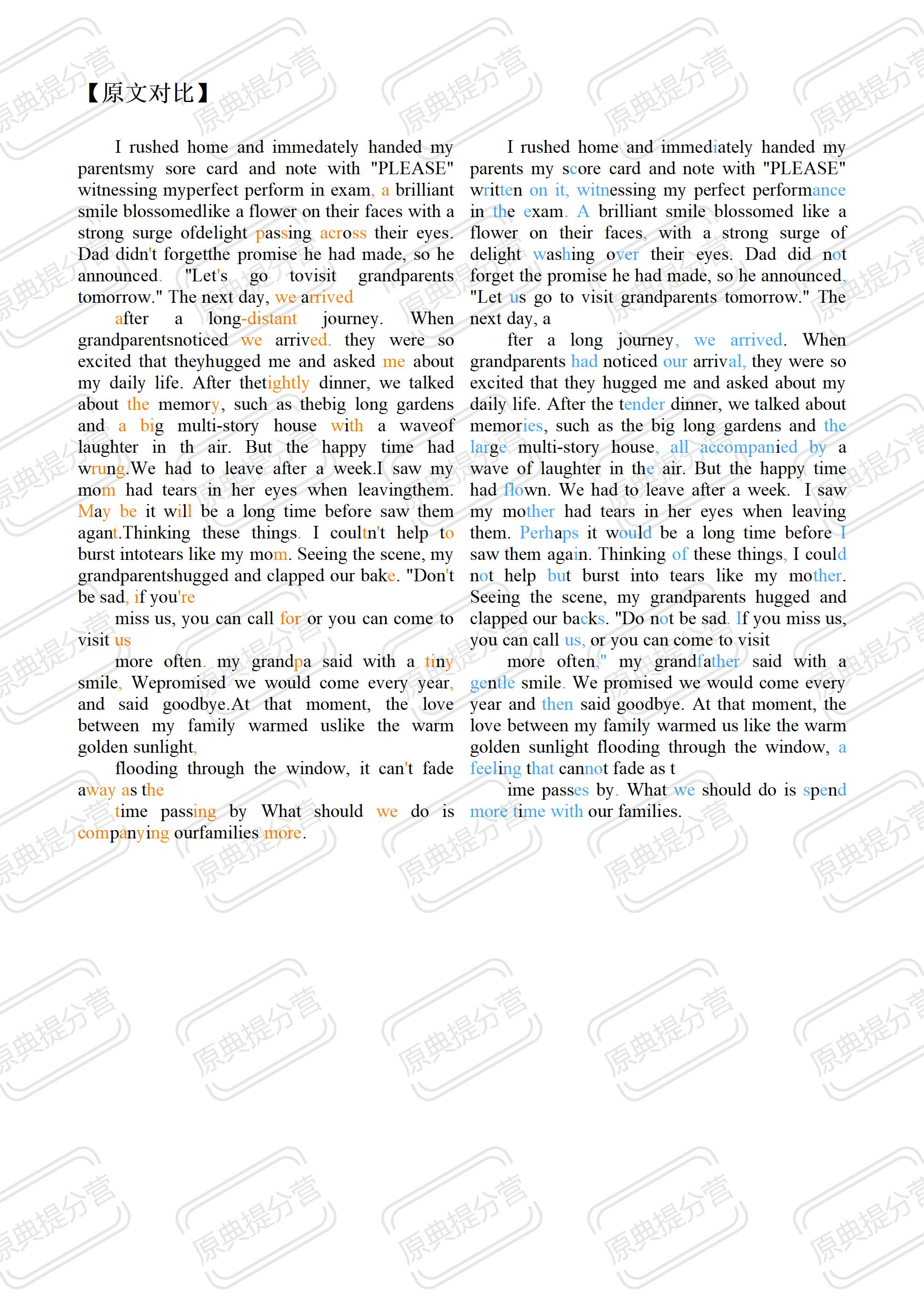 I rushed home and immedately handed my parents my sore card and note with “PLEASE” witnessing my perfect perform in exam, a brilliant smile blossomed like a flower on their faces with a strong surge of delight passing across their eyes. Dad didn’t forget the promise he had made, so he announced. “Let’s go to visit grandparents tomorrow.” The next day, we arrived after a long-distant journey. When grandparents noticed we arrived. they were so excited that they hugged me and asked me about my daily life. After the tightly dinner, we talked about the memory, such as the big long gardens and a big multi-story house with a wave of laughter in th air. But the happy time had wrung. We had to leave after a week.